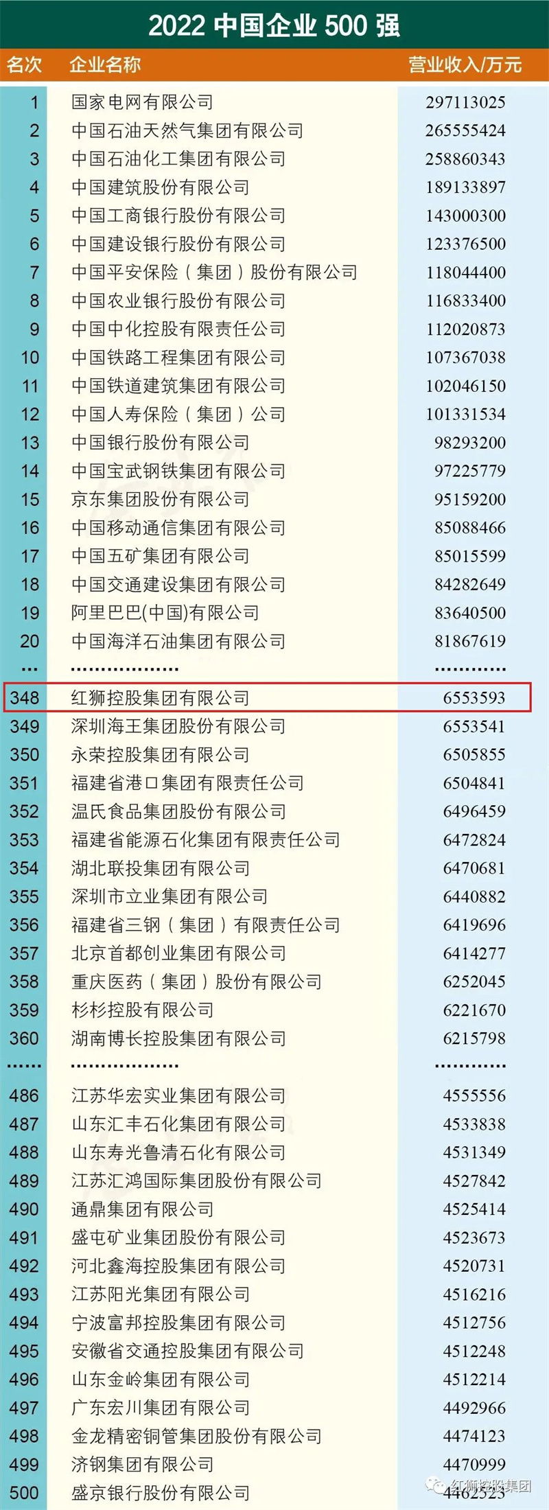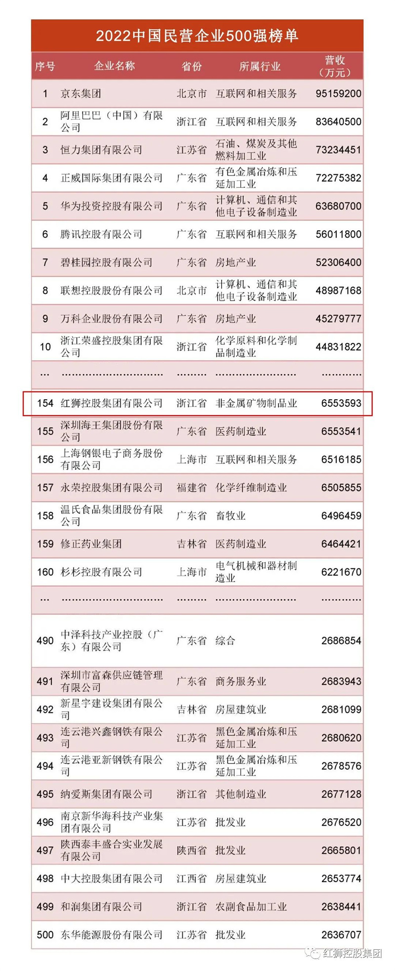 紅獅集團位列2022中國企業500強第348位、中國民營企業500強第154位