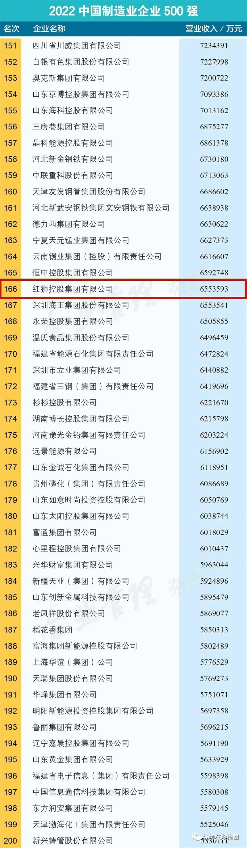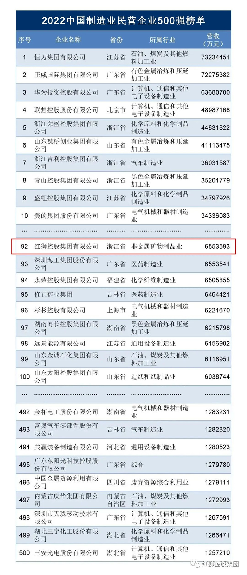 97日,全國工商聯發布2022中國民營企業500強、中國制造業民營企業500強榜單,紅獅集團重回其在中國民營企業500榜單的歷史最好成績,154位,中國制造業民營企業500強92營收一年時間猛增105億元,達655.4億元。紅獅用兩年時間,從500億大關突破600億大關,再次展示了其雄厚實力。