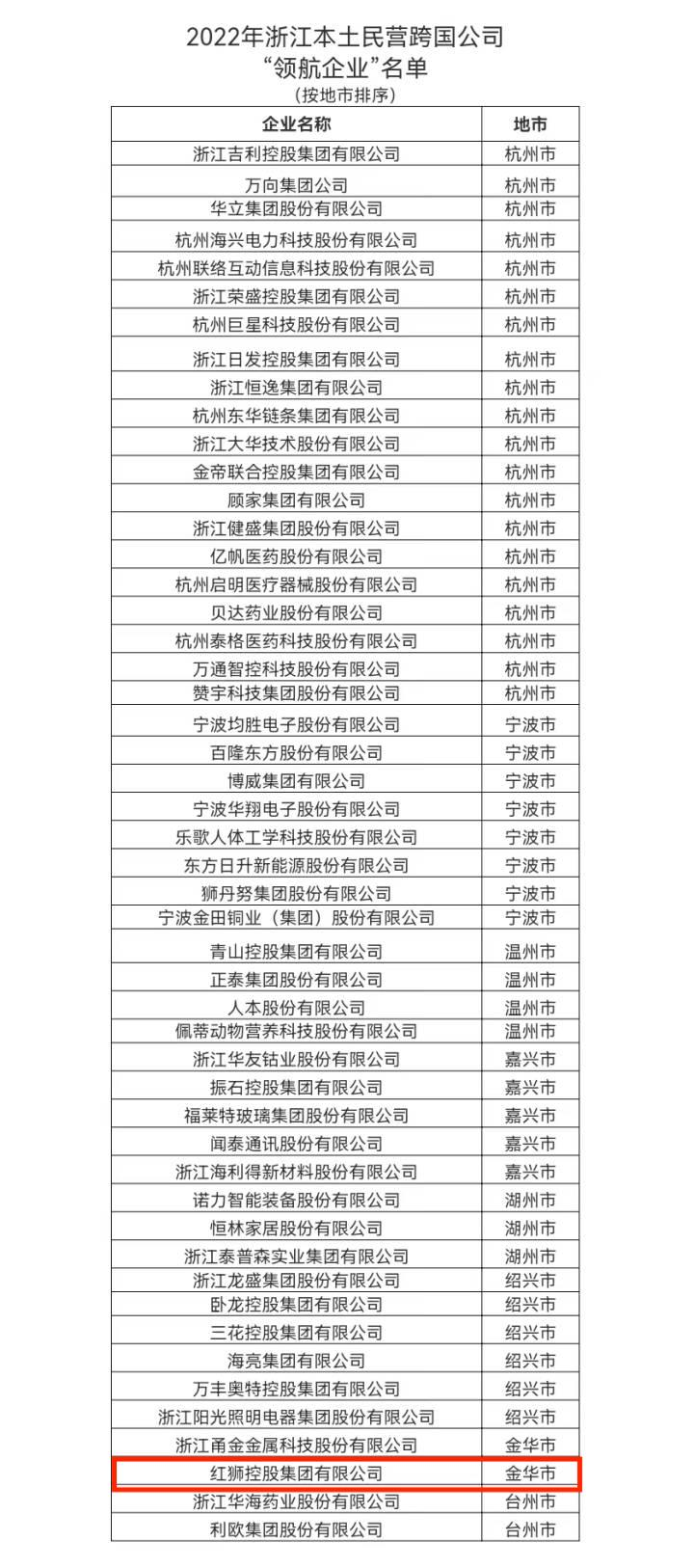紅獅集團入圍2022年度浙江本土民營跨國公司50家 “領航企業”名單
