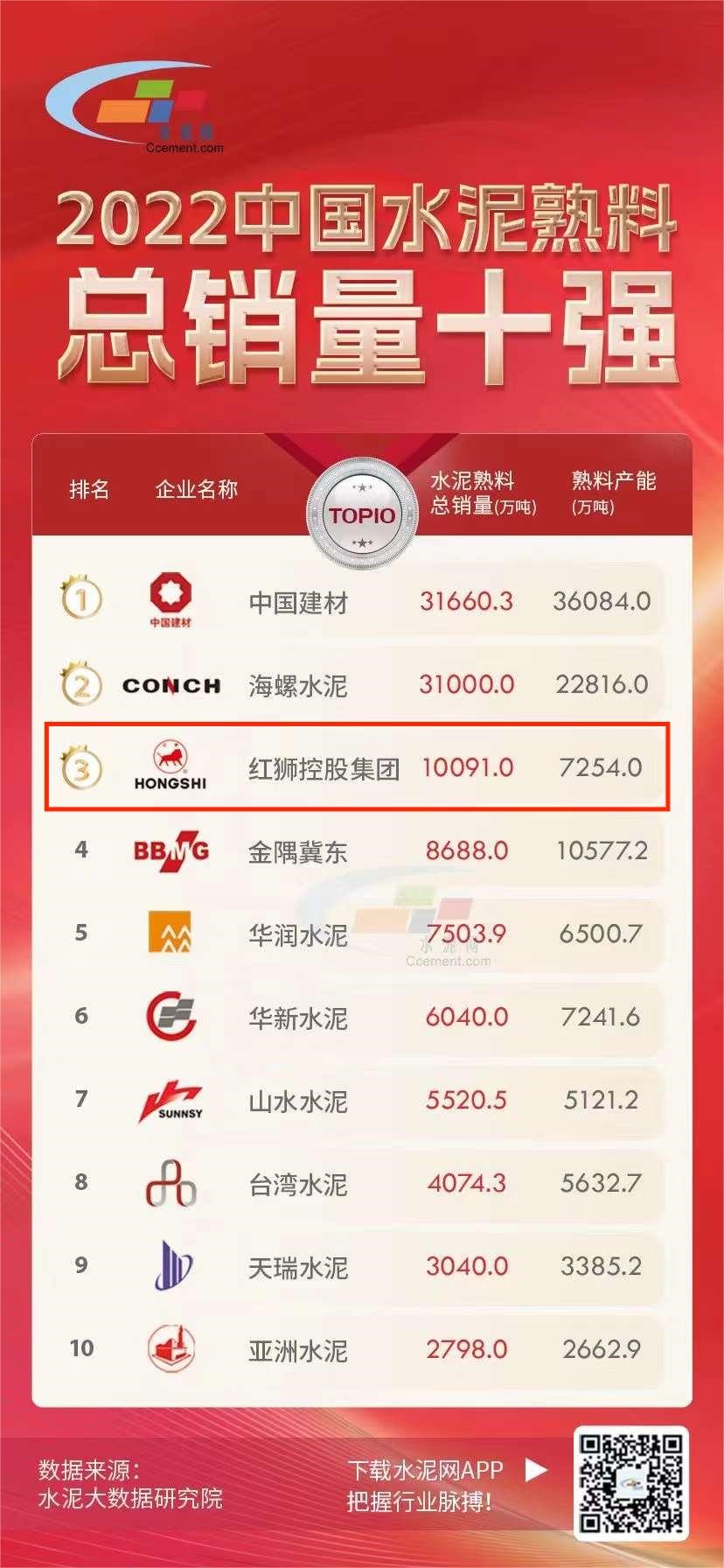 近日,中國(guó)水泥網(wǎng)水泥大數(shù)據(jù)研究院發(fā)布2022中國(guó)水泥熟料總銷(xiāo)量十強(qiáng)榜單,紅獅集團(tuán)以總銷(xiāo)量10091萬(wàn)噸位居第三。