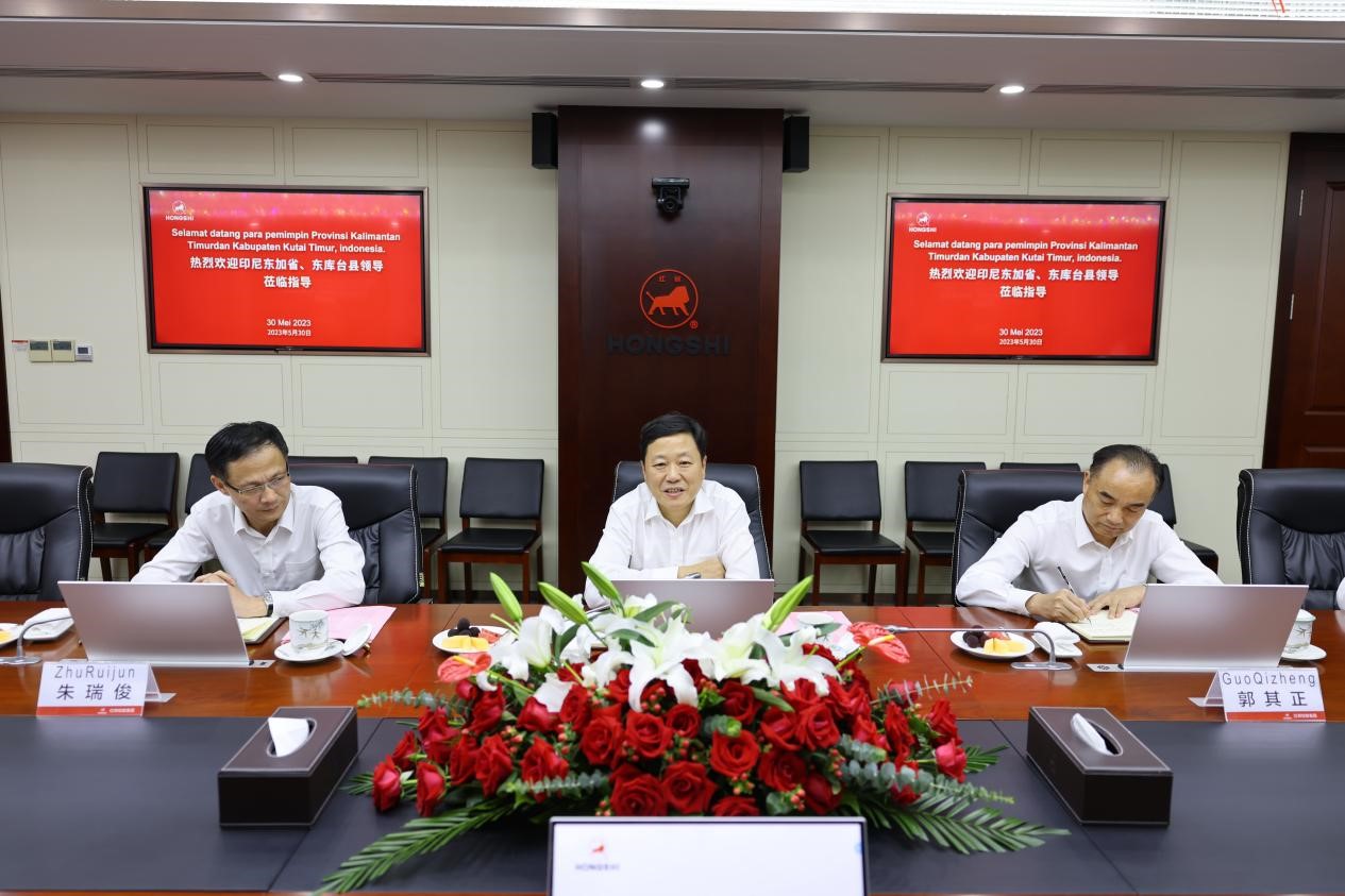 董事長章小華歡迎印尼東加省、東庫臺縣各位領導專程來紅獅集團總部考察,簡要介紹集團國內外協同發展和東加紅獅基本情況。章總表示,在東加省、東庫臺縣政府各部門的大力支持和周到服務下,東加紅獅現場各項工作進展順利,計劃7月份點火投產,近期東加紅獅還被評為“2022年度東加省最佳外國直接投資一等獎”,給予企業極大鼓勵。