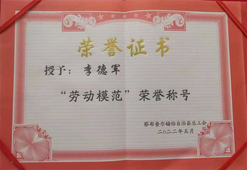 新疆金龍李德軍榮獲察布查爾縣總工會“勞動模范” 榮譽稱號